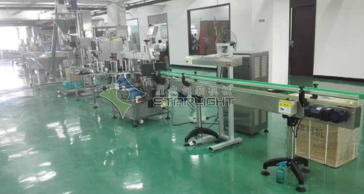 1、上料機 2、粉劑灌裝機 3、臺式旋蓋機 4、平面貼標機 5、噴碼機 6、電磁感應鋁箔封口機